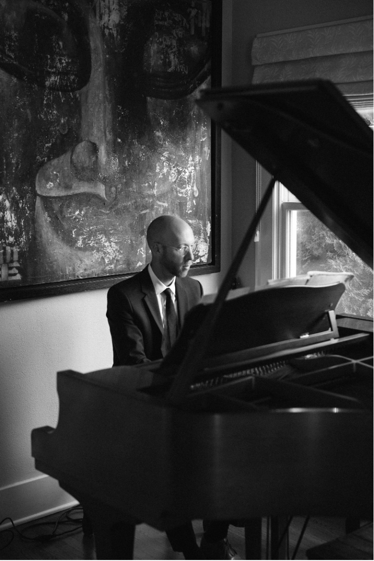 A man in glasses and a suit playing a grand piano in a room with large windows and curtain, with outdoor trees visible through the window.