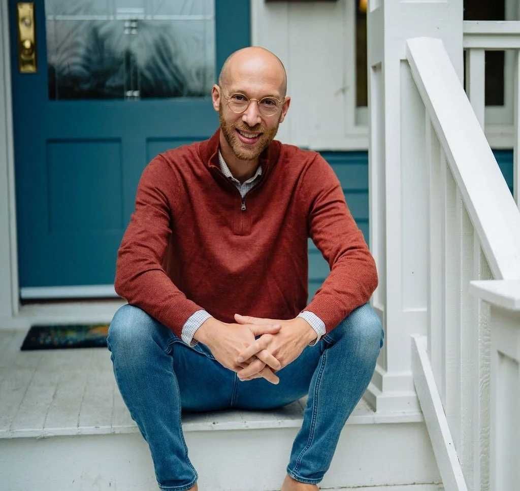 A smiling man with glasses and a beard sitting on porch steps in front of a blue door, wearing a red sweater and blue jeans.