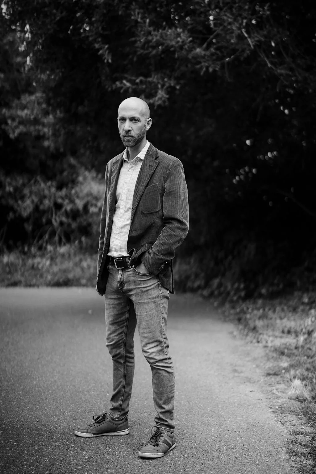 A man standing on a paved path with trees in the background, wearing casual clothing including a blazer, shirt, jeans, and sneakers, with one hand in his pocket, in black and white photography.